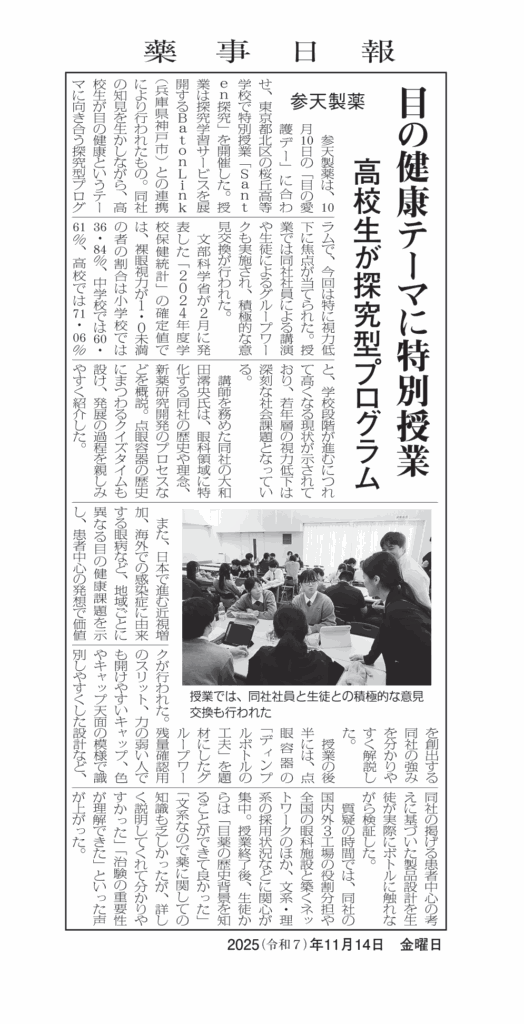2025.11.21 メディア 「薬事日報」掲載のお知らせ 2025年11月14日(金)「薬事日報」紙面にて、参天製薬株式会社と当社が桜丘高校で実施をした「Santen探究」の様子が紹介されました。 ◆薬事日報 2025年11月14日発行「薬事日報」掲載記事(許諾のもと転載) SHARE! TOPICS TOP